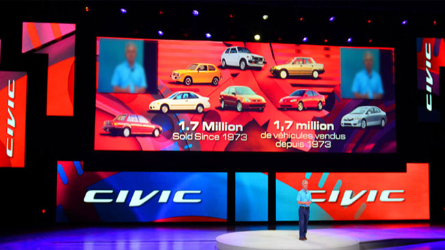 On the big, big stage, slides are not constrained to 16×9. We have extensive experience with ultrawide aspect ratio presentation design, including expertise in the technical needs for the design, specs, and working with the AV Production setup.